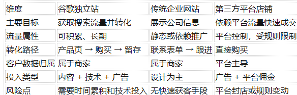 谷歌独立站更适合长期发展、积累客户资产和品牌,而平台适合短期销售和快速测试产品。传统官网在信任建设上有价值,但缺少流量获取机制。