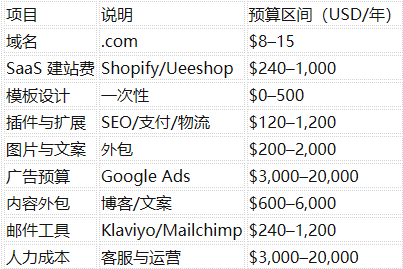 合计初期成本保守估计约 $7,000–50,000/年,取决于广告投入和团队规模。